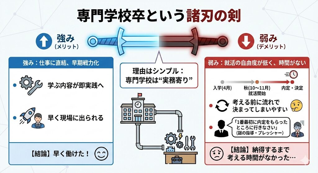 専門卒の強みは「早く現場に出られること」。弱みは「考える時間が短いこと」。まずはスタート地点を正確に見て、次の一手を選ぶのが大事。